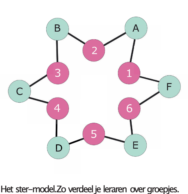Toen hebben we bedacht dat we de leraren in koppels van twee aan twee groepjes zouden koppelen. Dat had een groot voordeel, want nu had je docenten die alles wisten van de onderzoeken. Maar het had het nadeel dat die leraren zich er te veel mee gingen bemoeien, dat was ook niet goed. Toen hebben we uiteindelijk het ster-model verzonnen. Je hebt bijvoorbeeld zes groepjes en zes leraren. Leraar A begeleidt groepje 1 en 2, leraar B begeleidt groepje 2 en 3, leraar C groepje 3 en 4, etc. Dat werkte wèl.